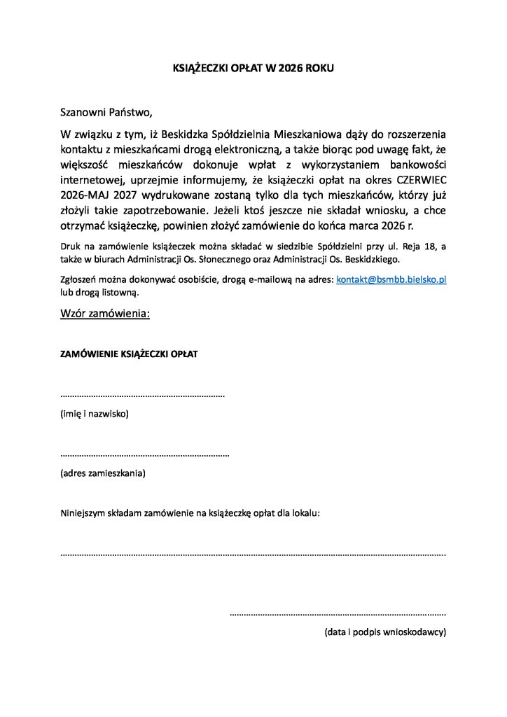 Szanowni Mieszkańcy, Zachęcamy do załatwiania spraw w Beskidzkiej Spółdzielni Mieszkaniowej drogą elektroniczną. Adresy e-mail poszczególnych działów są dostępne w zakładce KONTAKT/...
