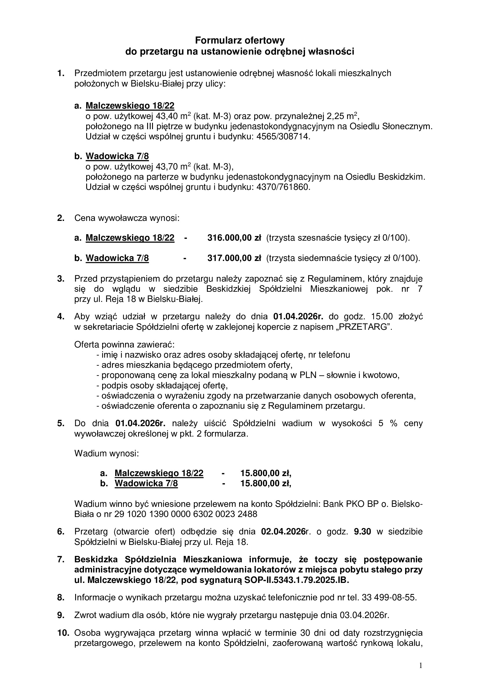 Przetarg na ustanowienie odrębnej własności lokali mieszkalnych.